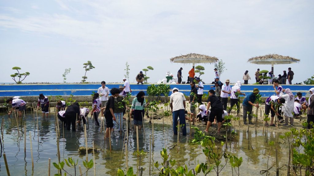 Dokumentasi: Mahasiswa UPER dan UTP saat melaksanakan penanaman mangrove dalam kegiatan Community Service Collaboration di pesisir Pulau Untung Jawa, Kepulauan Seribu, Selasa (02/05).