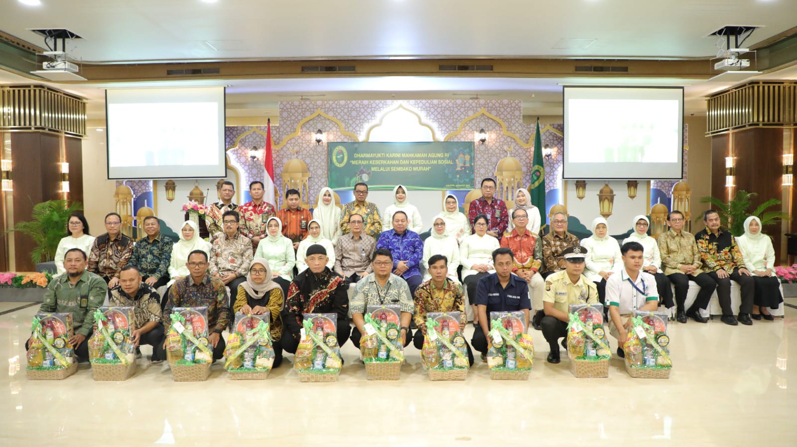 DelikAsia, (Jakarta) | Dharmayukti Karini Mahkamah Agung Republik Indonesia (DYK MARI) dan Ikatan Hakim Indonsia (IKAHI) memberikan paket sembako murah bagi satpam hingga marbot.