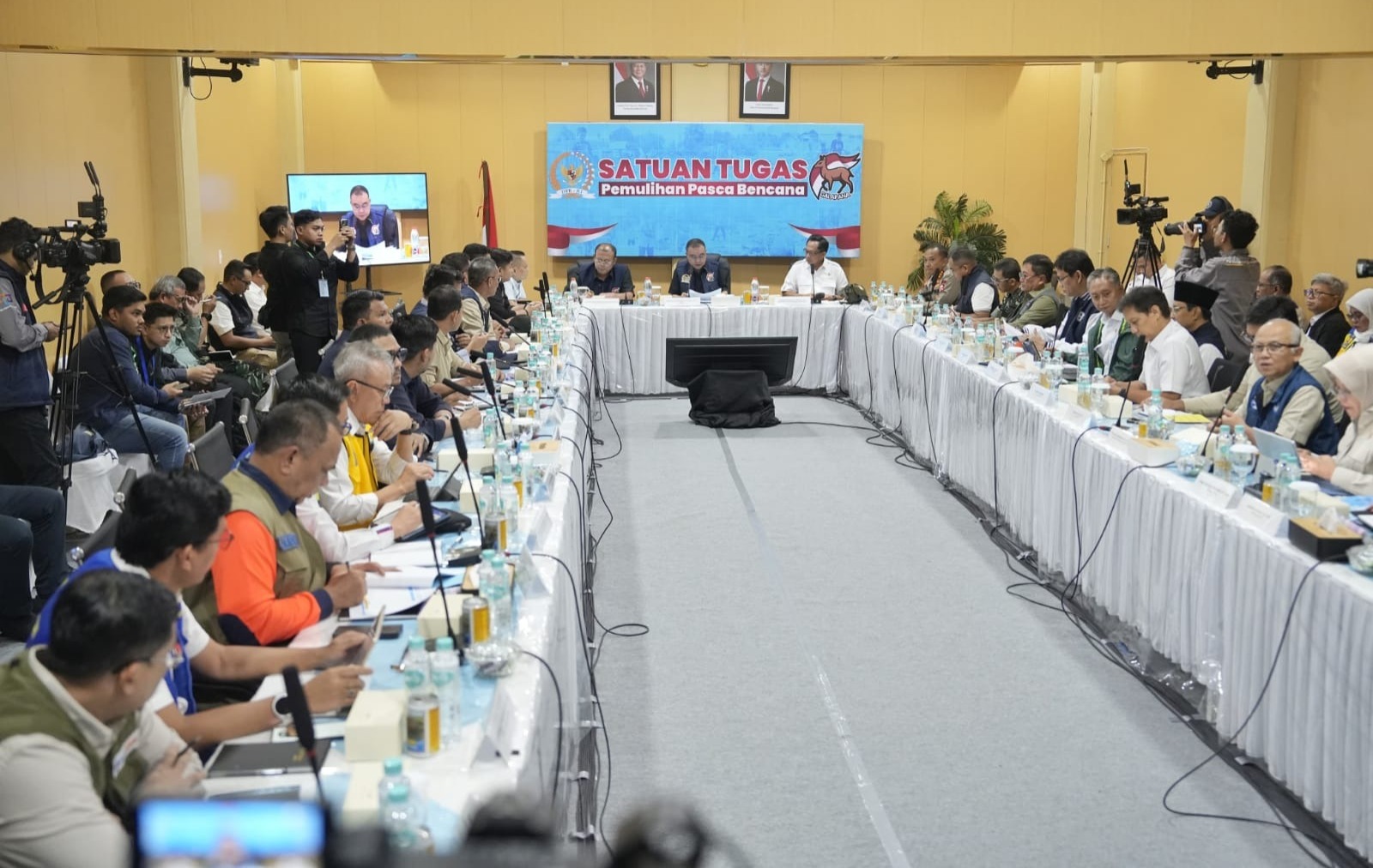 Perwakilan pemerintah yang hadir dalam rapat yakni Ketua Satgas Percepatan Rehabilitasi dan Rekonstruksi Pascabencana Pemerintah sekaligus Mendagri Tito Karnavian, Menteri Keuangan Purbaya Yudhi Sadewa, Menteri Kesehatan Budi Gunadi Sadikin, Menteri Perumahan Maruarar Sirait (Ara), Menteri PU Dody Hanggodo, Kepala BPS Amalia Adininggar Widyasanti, Wamendikdasmen Atip Latipulhayat, Wakil Kepala BPKP Agustina Arumsari, Wakil Kepala BP BUMN Teddy Barata, Sestama BNPB Rustian, Utusan Khusus Presiden Bidang Pembinaan Generasi Muda dan Pekerja Seni Raffi Ahmad, dan Wakasatgas III yang juga Wadankor Brimob Irjen Reza Arief Dewanto.