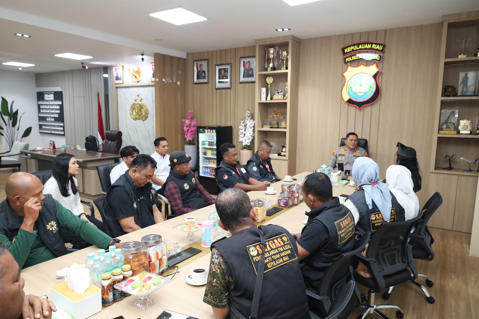 Rombongan Satgas PMI Bhakti Tuah Madani dipimpin oleh Ketua Umum DPW Satgas Bhakti Tuah Madani, Udin, didampingi Sekretaris Jenderal dan jajaran pengurus. Mereka diterima langsung oleh Kapolresta Barelang Kombes Pol Anggoro Wicaksono, S.H., S.I.K., M.H., di ruang Kapolresta lantai 2 Gedung Polresta Barelang.