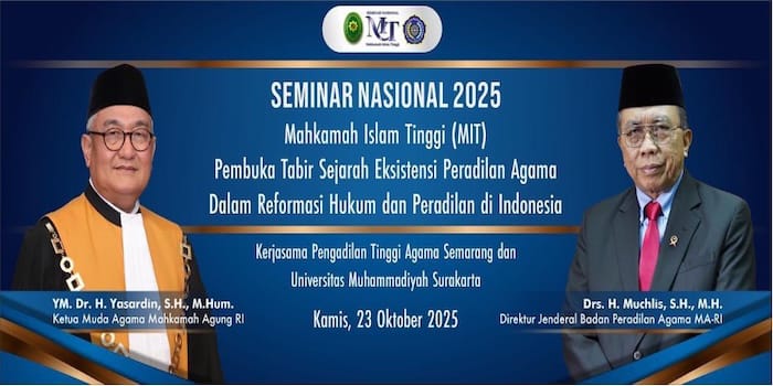 Seminar nasional bertajuk “Mahkamah Islam Tinggi (MIT) Pembuka Tabir Sejarah Eksistensi Peradilan Agama dalam Reformasi Hukum dan Peradilan di Indonesia“, menghadirkan Ketua Muda Kamar Agama Mahkamah Agung, Dr. H. Yasardin, S.H., M.Hum., selaku Keynote Speaker.