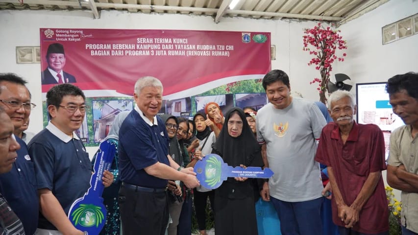 Delik Asia, (Jakarta) |  Menteri Perumahan dan Kawasan Permukiman (PKP) Maruarar Sirait didampingi Direktur Jenderal Perumahan Perkotaan Kementerian PKP Sri Haryati dan Wakil Ketua Yayasan Buddha Tzu Chi Indonesia Sugianto Kusuma (Aguan) melakukan serah terima kunci Program Bebenah Kampung Kerja Sama Dengan Yayasan Budha Tzu Chi kepada para penerima bantuan di Kelurahan Tanah Tinggi, Kecamatan Johar Baru, Jakarta Pusat, Sabtu (28/6/2025).