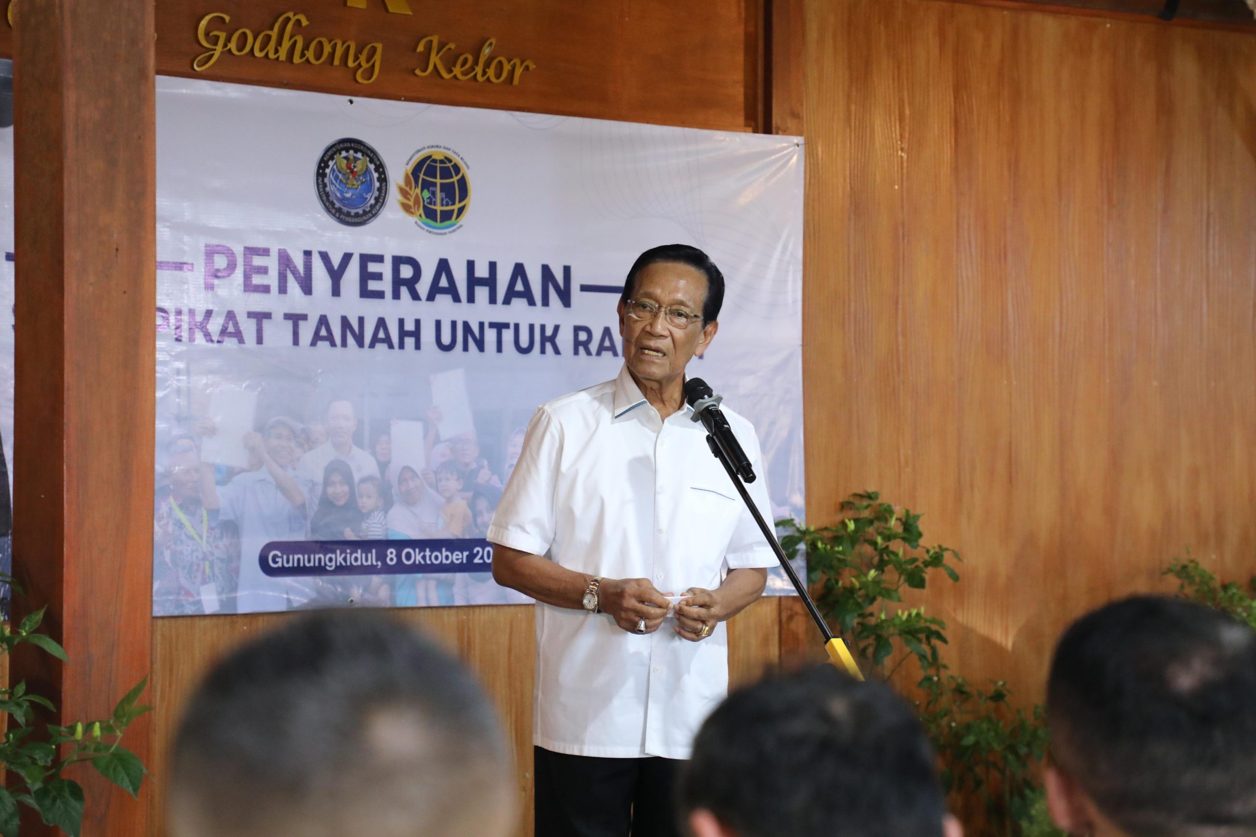 “Saya atas nama pemerintah daerah berterima kasih pada penyerahan sertipikat sebagian warga masyarakat Gunungkidul. Saya kira Bapak/Ibu bisa memahami arti pentingnya sertipikat itu bukti kekayaan aset yang ada pada satu keluarga, seperti Bapak/Ibu semua,” ujar Sri Sultan Hamengkubuwono X di hadapan masyarakat Gunungkidul.