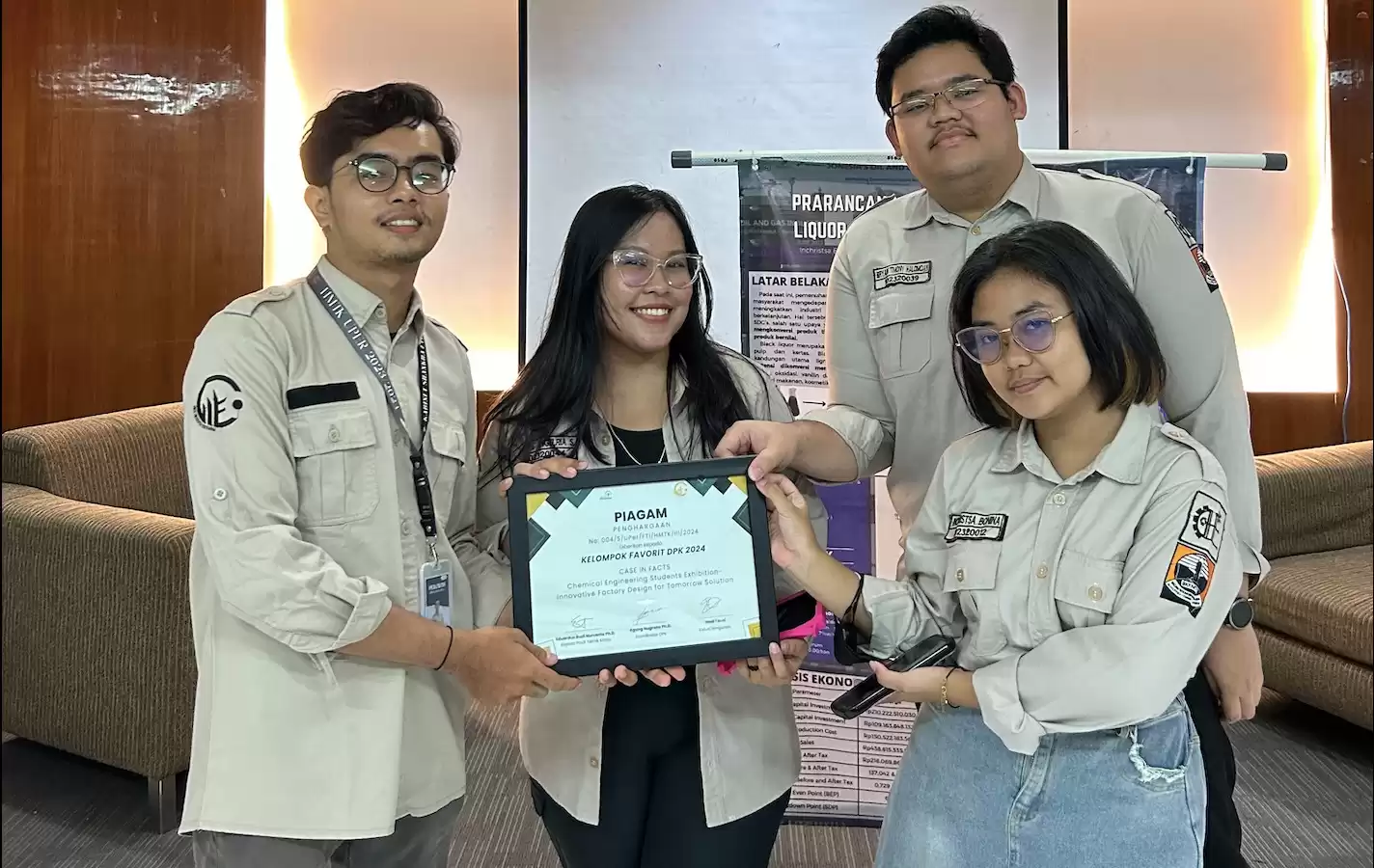 Sedangkan kelompok terfavorit dimenangkan oleh kelompok 6 dengan judul karya, ‘Prarancangan Pabrik Vanilin dari Black Liquor dengan Kapasitas 1.000 Ton/Tahun’, oleh Inchristsa Bonina, Bryan Timothy Halomoan H, dan Chris Angelria.
