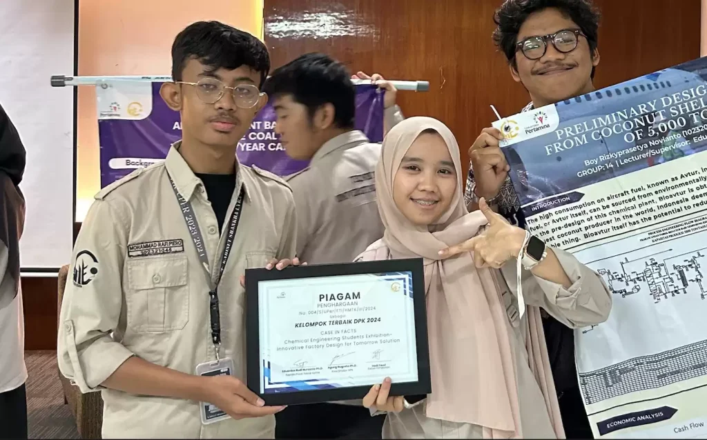 “Dalam menjawab tantangan konsumsi bahan bakar pesawat yang terus meningkat, kami memutuskan untuk membuat pra rancangan Desain Pabrik Kimia yang revolusioner tersebut. Keputusan inovatif ini menempatkan negara sebagai pelopor dalam produksi avtur berkelanjutan dengan memanfaatkan limbah dari pengolahan kelapa yang melimpah di Indonesia. DPK ini bukan hanya tentang menghasilkan bioavtur, tetapi juga tentang membuka pintu menuju masa depan yang lebih hijau dan berkelanjutan bagi penerbangan Indonesia,” ucap Boy Rizkyprasetya Novianto.