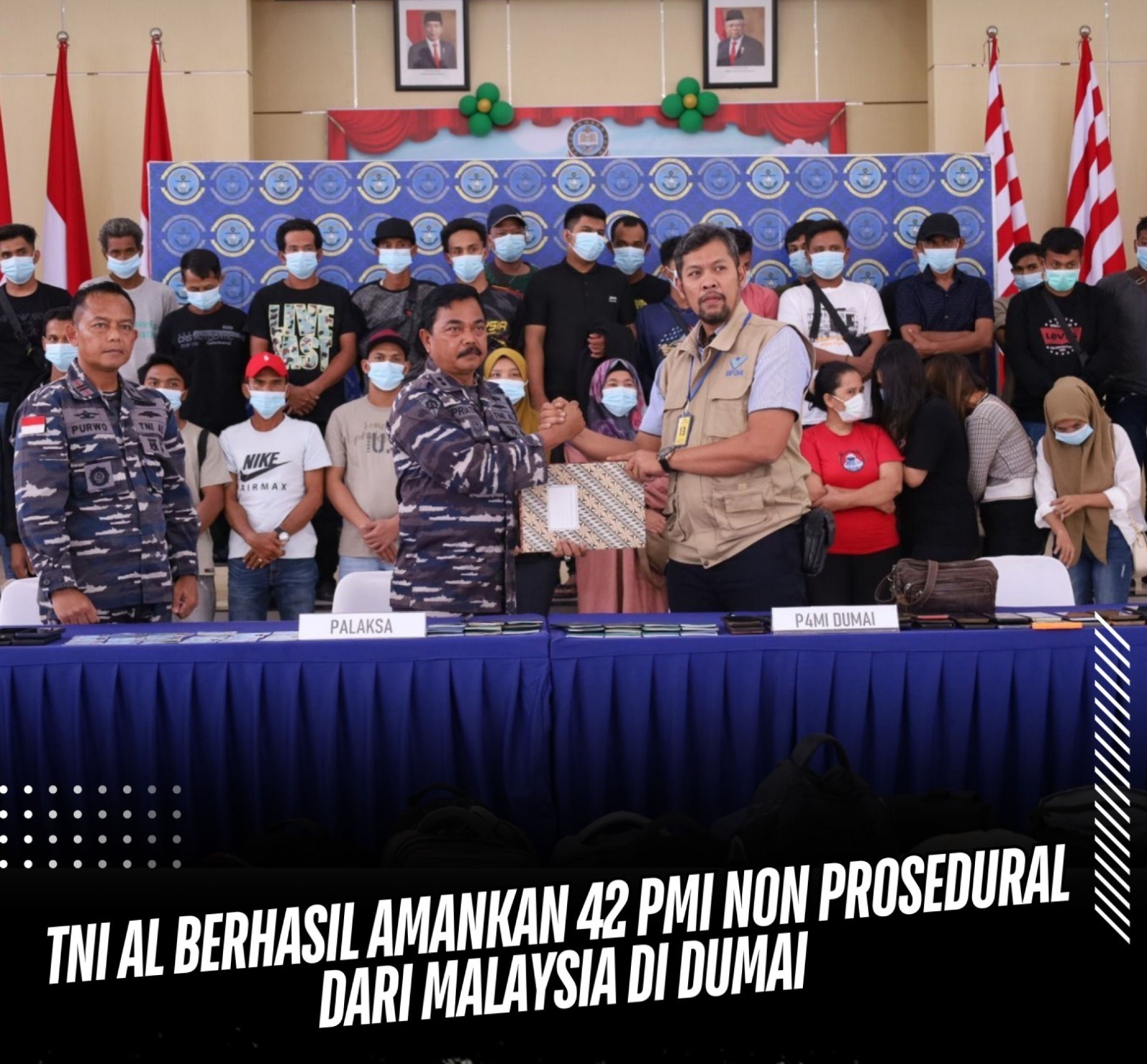 Setelah dilaksanakan pemeriksaan, Lanal Dumai menyerahkan 42 PMI Non Prosedural beserta barang bukti kepada pihak BP4MI Kota Dumai untuk dilaksanakan proses lebih lanjut.
