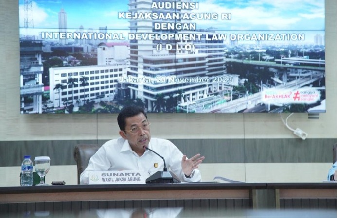DelikAsia.com, (Jakarta) | Wakil Jaksa Agung Dr. Sunarta memberikan sambutan pada acara Audiensi Kejaksaan RI dengan International Development Law Organization (IDLO) pada Senin 20 November 2023 di Ruang Rapat Wakil Jaksa Agung, Gedung Utama Kejaksaan Agung, Jakarta.