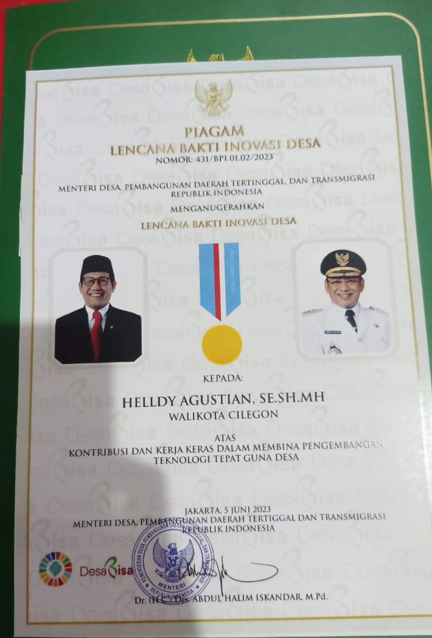 Penghargan Satya Lencana Bakti Inovasi tersebut merupakan raihan yang pertama diterima oleh Helldy, sekaligus menjadi penghargaan ke-33 kali untuknya selama memimpin Kota Cilegon.