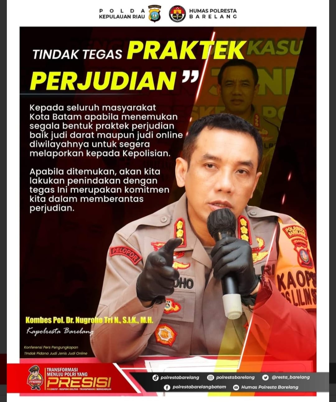Foto: Kepala Kepolisian Resor (Kapolresta) Barelang, Kombes Pol. Nugroho Tri Nuryanto, int DelikAsia.com, (Batam) | Kinerja Kepala Kepolisian Daerah (Kapolda) Provinsi Kepulauan Riau, Irjen Pol. Yan Fitri Halimansyah, dan Kepala Kepolisian Resor (Kapolresta) Barelang, Kombes Pol. Nugroho Tri Nuryanto, dipertanyakan, pasca beroperasinya arena judi gelanggang permainan (Gelper) di Kota Batam dengan bebas. Para pemilik Gelper ini seolah “kebal hukum” dan tidak menghormati umat muslim di momen bulan puasa.