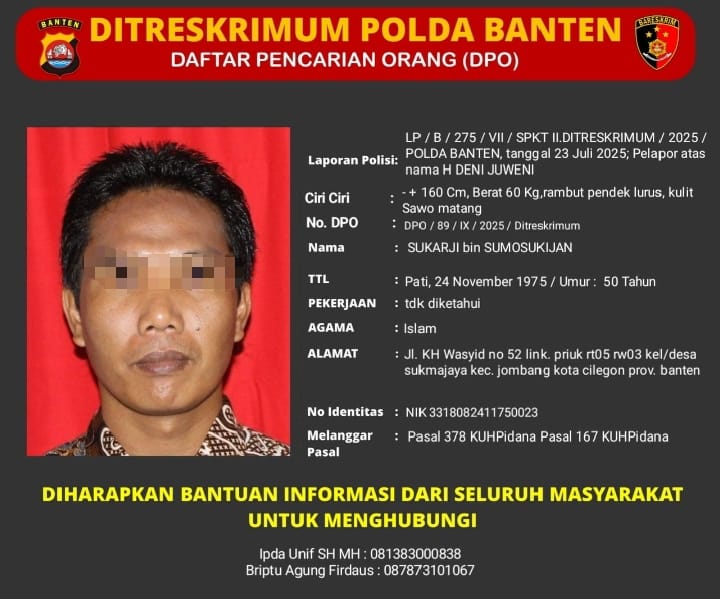 Delik Asia, (Cilegon) | Direktorat Reserse Kriminal Umum (Ditreskrimum) Polda Banten resmi menerbitkan Daftar Pencarian Orang (DPO) terhadap seorang pria bernama Sukarji bin Sumosukijan, yang diduga terlibat dalam tindak pidana penipuan dan/atau penggelapan sebagaimana dimaksud dalam Pasal 378 KUHP dan Pasal 167 KUHP.