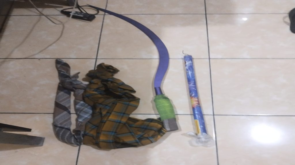 Sedangkan Barang Bukti yang berhasil diamankan petugas berupa 2 (dua) buah sarung warna coklat yang di bentuk senjata /gadam, 1 (satu) buah Clurit Panjang Warna Ungu,1 (satu) buah petasan jenis mercon ukuran 1,5 x 10 inch