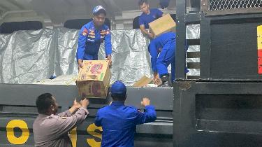 Setelah tiba di pelabuhan, bantuan ini langsung diturunkan dan diangkut menggunakan truk Polri yang dikawal menuju lokasi pengungsian.