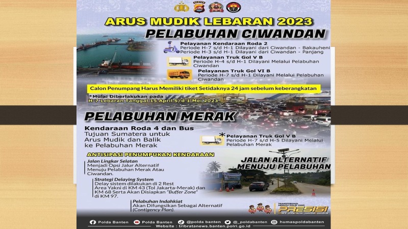 Karo Ops Polda Banten Kombes Pol Dedi Suhartono mengatakan bahwa terdapat dua pelabuhan yang dioperasikan dalam mudik tahun ini. “Terdapat dua pelabuhan yang dioperasikan dalam mudik tahun 2023 yaitu pelabuhan Ciwandan dan pelabuhan Merak,” ucap Dedi pada Sabtu (09/04).