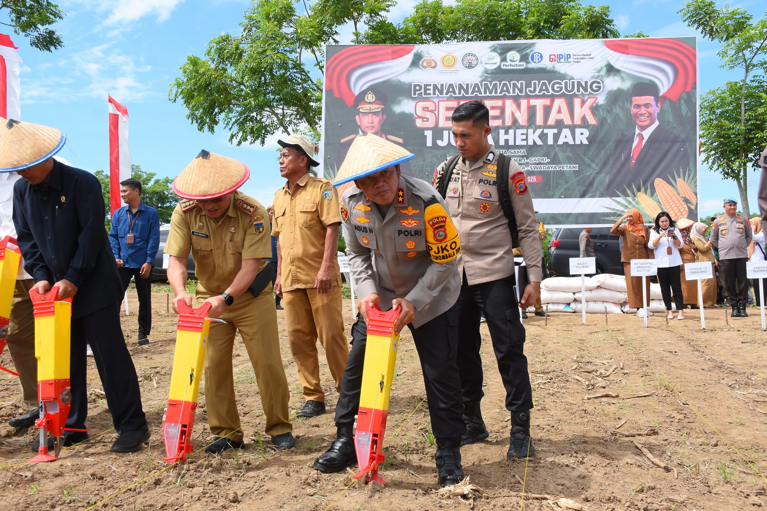 Kapolda Sulteng, Irjen Pol. Dr. Agus Nugroho, S.I.K., S.H., M.H., bersama unsur Forkopimda Sulawesi Tengah, Kepala Dinas terkait, akademisi, dan masyarakat turut serta menanam benih jagung di lahan seluas 30 hektar.