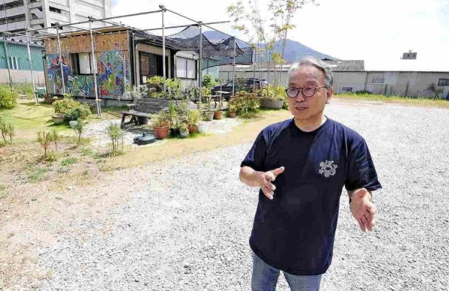 Keterangan Foto: Tomoshi Okuda berbicara tentang rencana pembangunan di lokasi bekas kantor pusat Kudo-kai di Ward Kokurakita, Kitakyushu, pada 1 Agustus. FOTO: THE YOMIURI SHIMBUN.