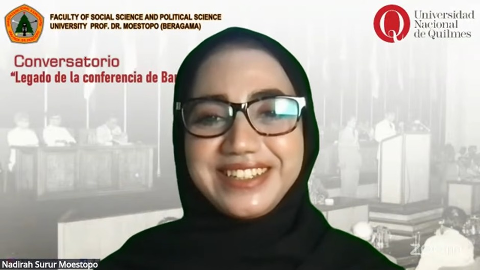 Delik Asia, (Buenos Aires) | Kiprah akademisi Universitas Prof. Dr. Moestopo (Beragama) kembali menembus forum internasional. Ketua Program Studi sekaligus Dosen Hubungan Internasional, Nadirah, S.Sos., M.A., tampil sebagai narasumber dalam kegiatan Conversatorio bertema “Legado de la Conferencia de Bandung” yang digelar Universidad Nacional de Quilmes (UNQ), Argentina, Rabu (8/10), secara daring.