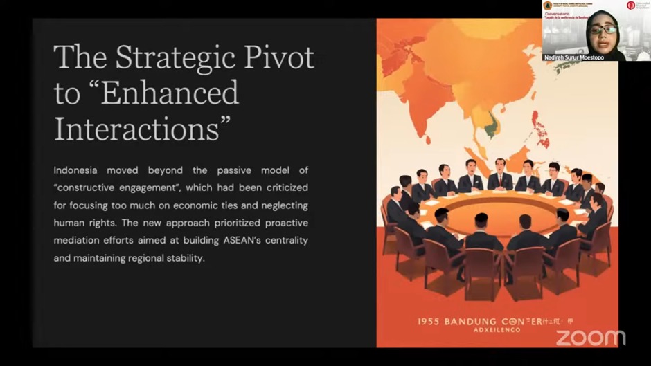 “Prinsip-prinsip Bandung menjadi fondasi penting bagi kerja sama internasional yang lebih adil dan inklusif. Di tengah krisis global dan dinamika geopolitik yang kompleks, nilai-nilai ini perlu terus diperjuangkan, termasuk di kawasan Asia Tenggara,” ujar Nadirah.