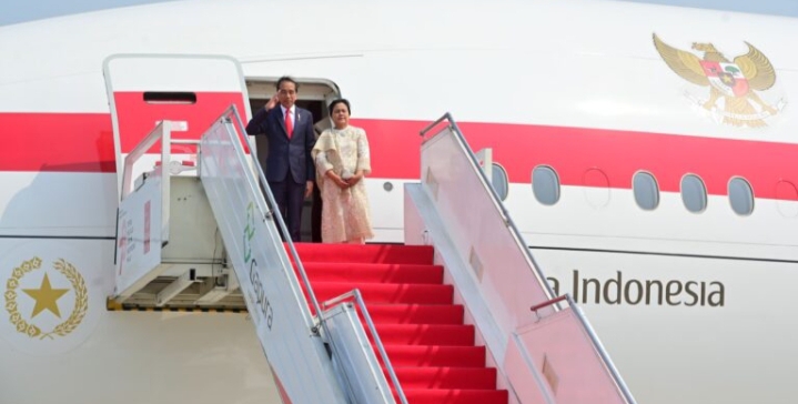 Presiden dan Ibu Iriana bersama rombongan lepas landas dari Bandar Udara Internasional Soekarno Hatta, Tangerang, Provinsi Banten, sekira pukul 14.45 WIB.