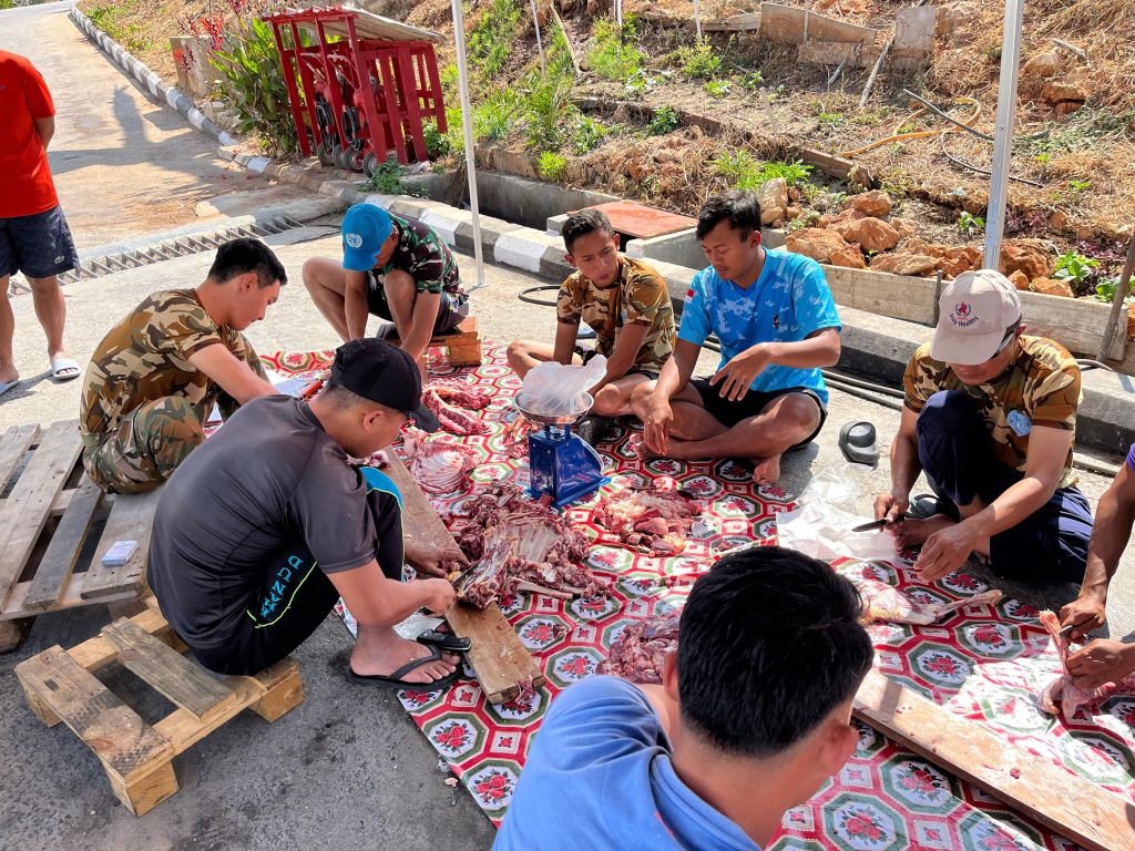 Usai sholat, acara dilanjutkan dengan pemotongan hewan qurban pada pukul 08.00 LT, yang terdiri dari 7 ekor kambing hasil gotong royong personel Kontingen Garuda. Proses penyembelihan dilaksanakan dengan penuh hikmah, sesuai dengan syariat Islam dan protokol kebersihan yang berlaku. Ketua Panitia Pemotongan Hewan Qurban, Lettu Laut (P) Imam Suganda, S.Tr.Han., menyampaikan bahwa seluruh tahapan dilakukan dengan penuh tanggung jawab dan semangat kebersamaan, sebagai bentuk ibadah sekaligus penguatan nilai kekompakan satuan.