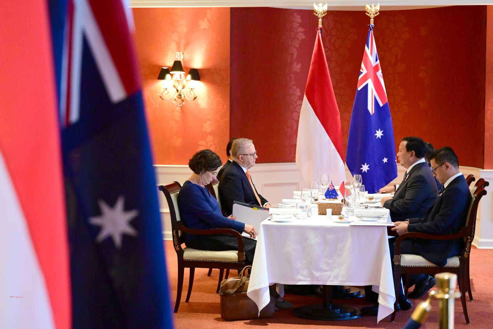 Presiden Prabowo didampingi oleh Menteri Luar Negeri Sugiono dan Sekretaris Kabinet Teddy Indra Wijaya. Sementara itu, dari pihak Australia, turut hadir Penasihat Utama Internasional Kantor Perdana Menteri Australia, Kathy Klugman, serta Asisten Sekretaris Pertama Divisi Internasional Departemen Perdana Menteri dan Kabinet, Pablo Kang.[Red/**]
