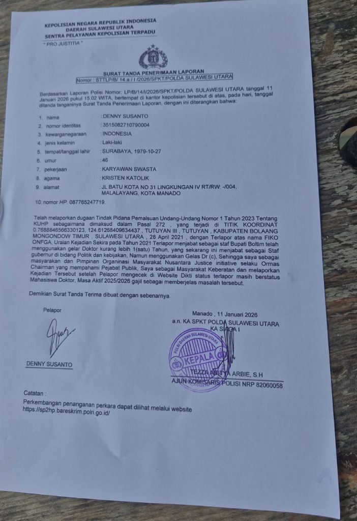 Manado, (Delik Asia) | Dugaan penggunaan gelar akademik tidak sah oleh seorang pejabat publik di Sulawesi Utara kini menjadi perhatian aparat penegak hukum. Seorang warga negara sekaligus pimpinan organisasi masyarakat Nusantara Justice Initiative,