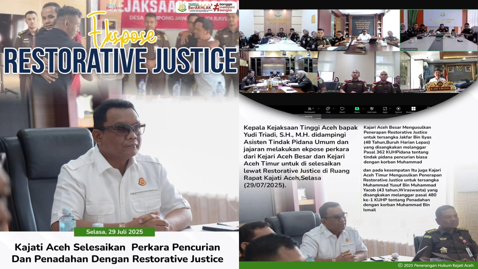 Ekspose berlangsung secara virtual dari Ruang Rapat Kajati Aceh, dan turut diikuti oleh Jaksa Agung Muda Tindak Pidana Umum (Jampidum) serta Direktur A pada Jampidum. Hadir dalam kegiatan ini Kepala Kejari Aceh Besar dan Aceh Timur beserta jajaran masing-masing.