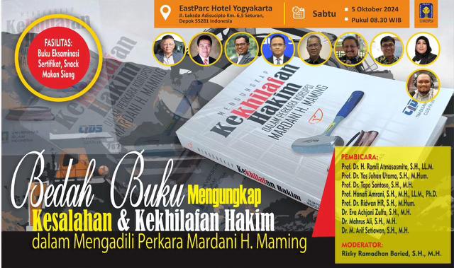Hal ini diungkapkan para pakar hukum di dalam buku yang berjudul “Mengungkap Kesalahan dan Kekhilafan Hakim Dalam Mengadili Perkara Mardani H. Maming,” yang diterbitkan oleh Center of Leadership and Law Development Studies (CSLD) Fakultas Hukum Universitas Islam Indonesia, bekerja sama dengan Penerbit Buku Rajawali (PT Raja Grafindo).
