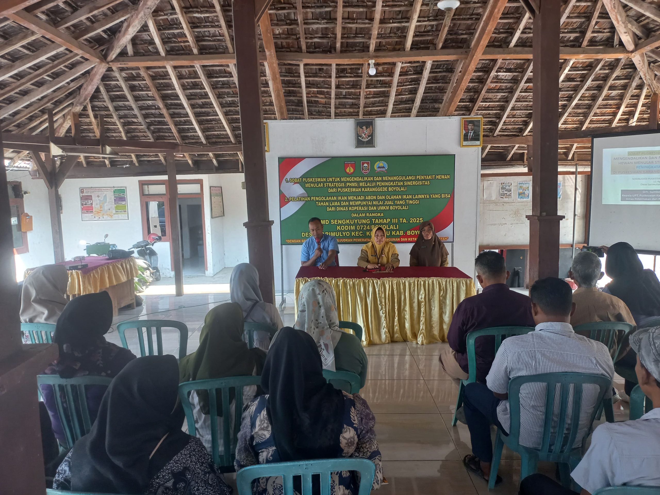 Delik Asia, (Boyolali) | Untuk menekan penyebaran penyakit menular pada hewan ternak, Satgas TNI Manunggal Membangun Desa (TMMD) Sengkuyung Tahap III Tahun 2025 Kodim 0724/Boyolali menggandeng Dinas Peternakan Kabupaten Boyolali menggelar sosialisasi pengendalian dan penanggulangan penyakit hewan. Kegiatan berlangsung di Aula Balai Desa Sarimulyo, Kecamatan Kemusu, Senin, 11 Agustus 2025.