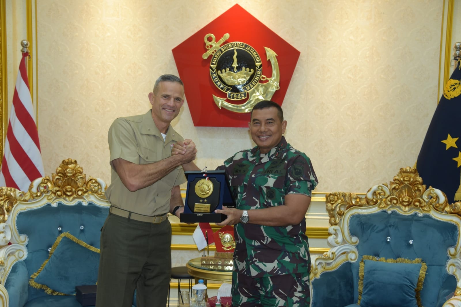 DelikAsia.com, (Jakarta) | Komandan Korps Marinir (Dankormar) Mayor Jenderal TNI (Mar) Dr. Endi Supardi, S.E., M.M., M.Tr. Opsla., CHRMP., CRMP., menerima courtesy call dari Brigadir Jenderal Andrew Niebel, Komandan 1st Marine Logistic Groups, di Gedung Utama Markas Komando Korps Marinir (Mako Kormar), Jakarta Pusat, pada Jumat (01/11/2024).