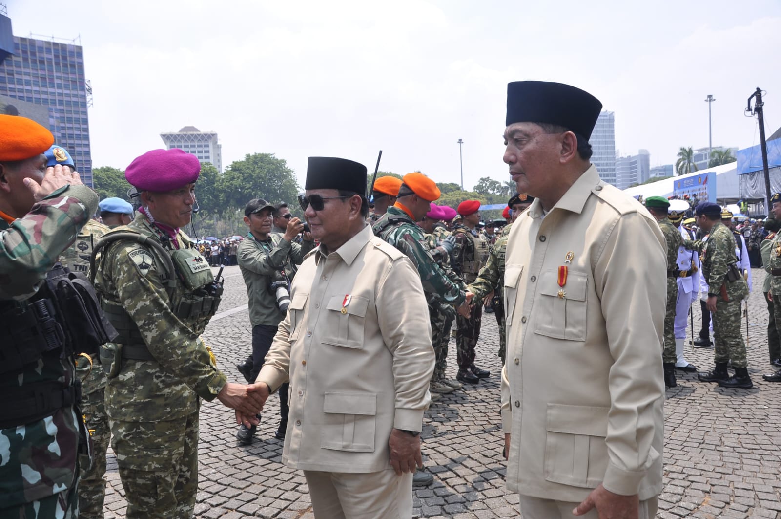 Delik Asia, (Jakarta) | Mayjen TNI (Mar) Ili Dasili, S.E., yang sehari-hari menjabat sebagai Komandan Pasmar 1 (Danpasmar 1) memimpin ribuan prajurit Jalasena TNI AL untuk memberikan penghormatan kepada Presiden Republik Indonesia Bapak Prabowo Subianto pada Upacara peringatan Hari Ulang Tahun (HUT) ke-80 TNI yang digelar di Lapangan Silang Monas, Jakarta Pusat, Minggu (05/10/2025).