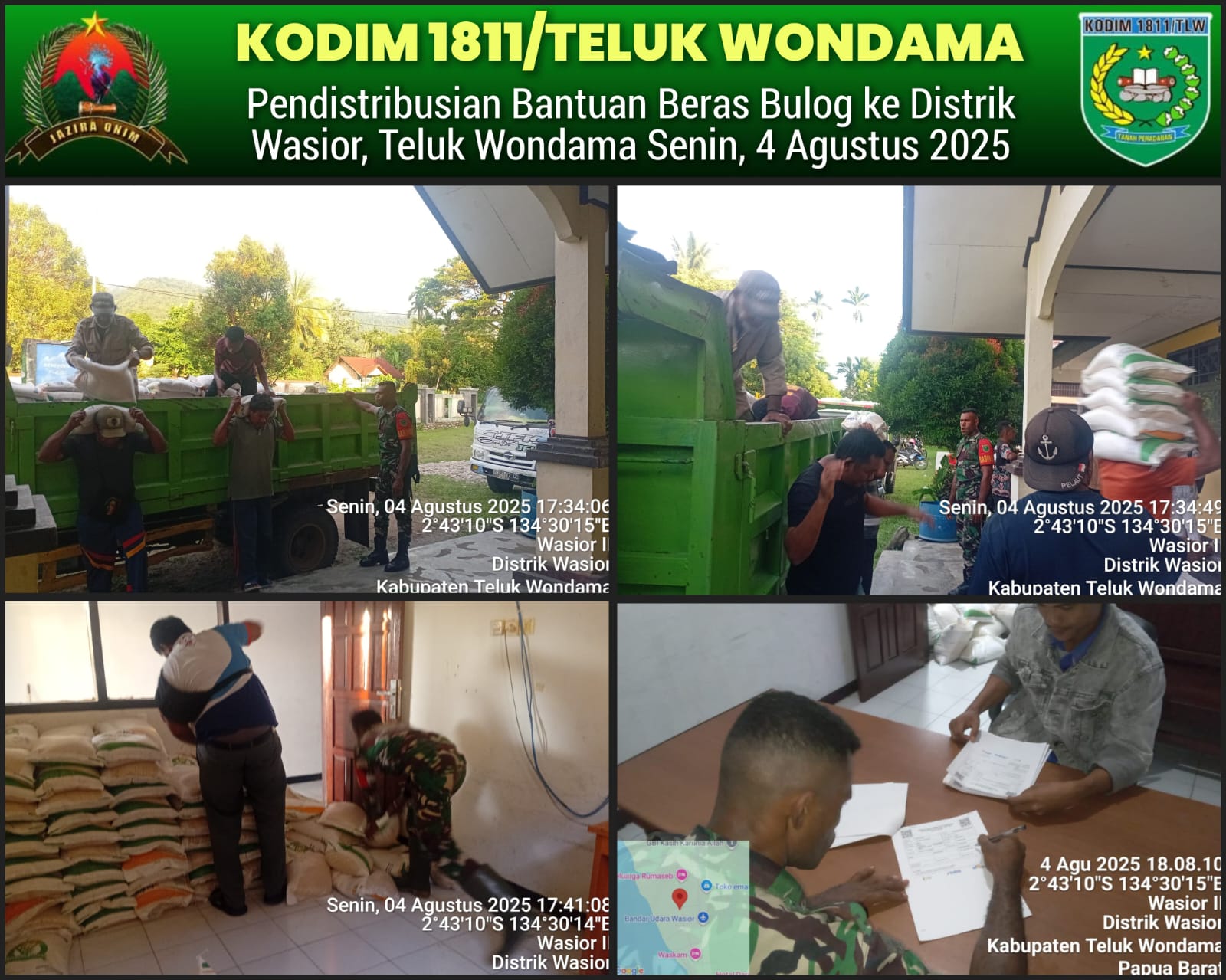 Delik Asia, (Manokwari) | Pemerintah melalui Bulog Manokwari bekerja sama dengan TNI AD dari Kodim 1811/Teluk Wondama kembali menyalurkan bantuan pangan beras tahun 2025 ke wilayah-wilayah terpencil di Kabupaten Teluk Wondama. Kegiatan yang berlangsung sejak 31 Juli hingga 6 Agustus 2025 ini menjangkau 13 distrik dengan total 5.597 karung beras @10 kg.