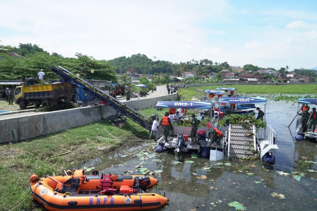 “Rencananya eceng gondok ini akan kita manfaatkan menjadi pupuk. Tapi memang perlu zat khusus untuk jadi pupuk. Untuk pembersihan, kita akan gunakan empat paket peralatan, masing-masing paket terdiri dari dua perahu ponton dan satu conveyor. Jadi total akan ada delapan ponton dan empat conveyor di sini,” jelas Kasad.