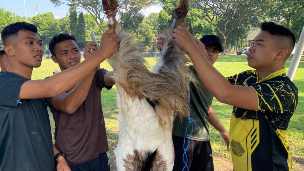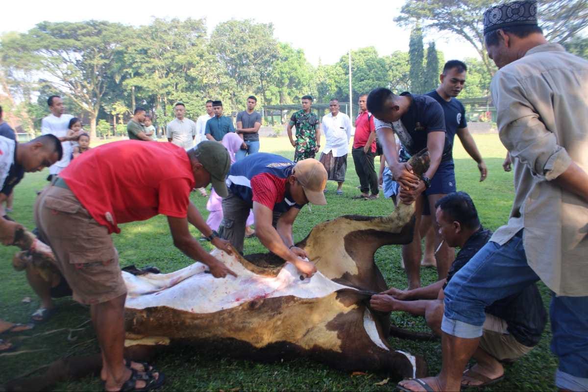 Setelah melaksanakan sholat Idul Adha dilanjutkan dengan pemotongan hewan kurban yang dipimpin langsung Danmenarmed Letkol Arm Siswo Budiarto, S.I.P., M.M., M.I.Pol., beserta staf jajarannya.