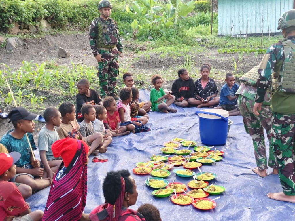 Suasana penuh kehangatan dan kekeluargaan tampak di Pos Kurima Satgas Yonif 521/DY ketika personel pos menggelar acara Makan Bersama dengan masyarakat sekitar.