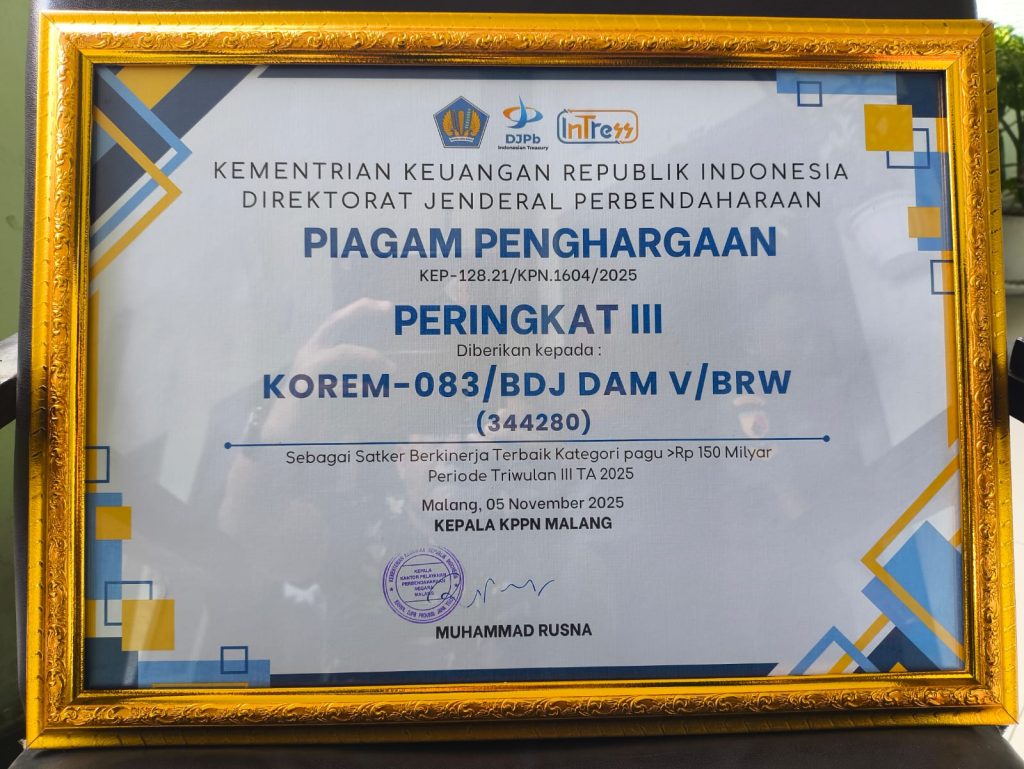 Delik Asia, (Malang) | Kinerja anggaran Korem 083/Baladhika Jaya kembali mendapat apresiasi dari Kantor Pelayanan Perbendaharaan Negara (KPPN) Malang. Dalam Press Release APBN dan Penyerahan Penghargaan Satker Berkinerja Terbaik Triwulan III Tahun 2025, Korem 083/Bdj dinobatkan sebagai peringkat III untuk kategori satker dengan pagu Rp150 miliar. Acara berlangsung pada Kamis (5/11/2025) di Aula RCE Center Gedung Cagar Budaya KPPN Malang.