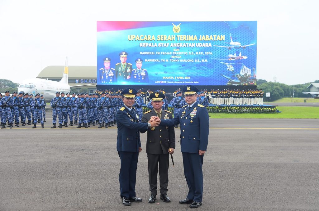 DelikAsia.com, (Jakarta) | Panglima TNI Jenderal TNI Agus Subiyanto, S.E., M.Si, memimpin Upacara Serah Terima Jabatan (Sertijab) Kepala Staf Angkatan Udara (Kasau) dari Marsekal TNI Fadjar Prasetyo, S.E., M.P.P., C.S.F.A. kepada Marsekal TNI Mohamad Tonny Harjono, S.E., M.M., bertempat di Taxi Way Echo, Landasan Udara Halim Perdana Kusuma, Jakarta Timur, Jum’at. (05/04/2024)