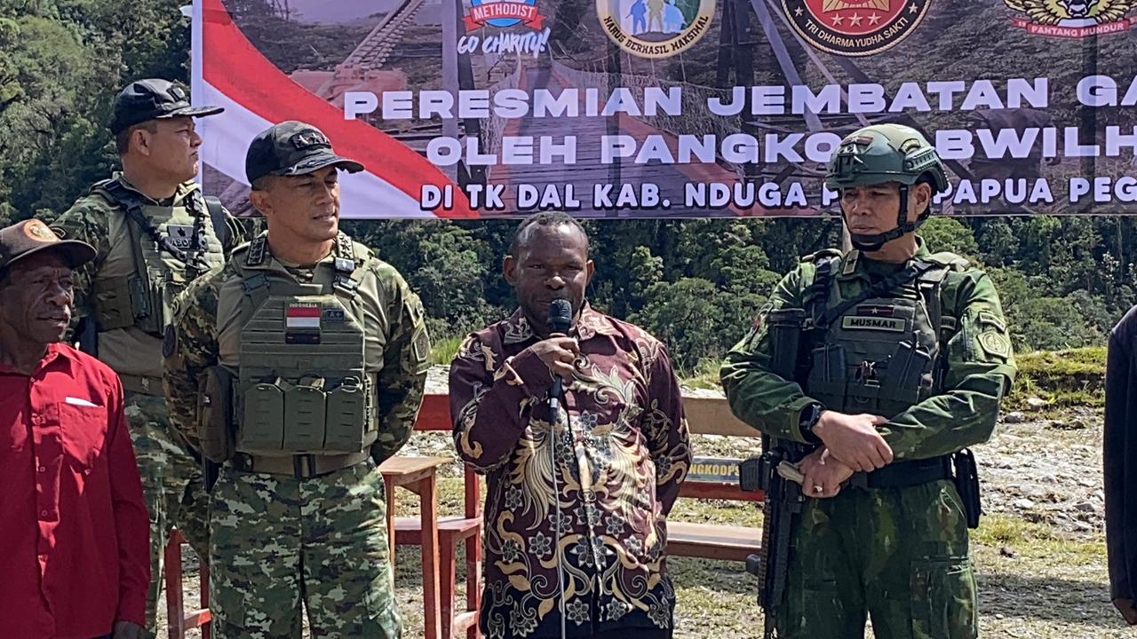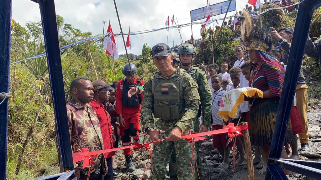 Delik Asia, (Nduga, Papua) | Panglima Komando Gabungan Wilayah Pertahanan III (Pangkogabwilhan III), Letjen TNI Bambang Trisnohadi, secara resmi meresmikan Jembatan Gantung Kampung (KP) Dal di Distrik Dal, Kabupaten Nduga, Papua. Pembangunan jembatan ini merupakan wujud nyata kehadiran negara dalam meningkatkan konektivitas dan kesejahteraan masyarakat di wilayah terdepan Indonesia. (22 Oktober 2025).