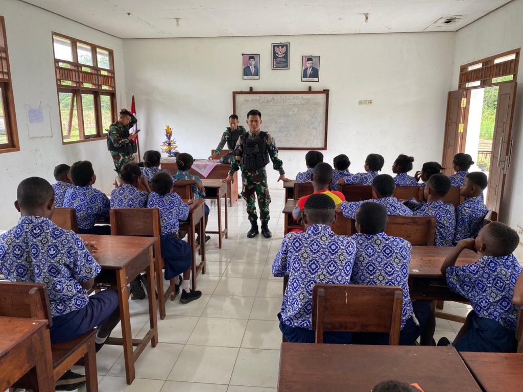 “Dalam mendukung terselenggaranya pelaksanaan tugas pengamanan wilayah perbatasan , kami melaksanakan kegiatan Tenaga pendidik Mengajar kepada parasiswa SD N 2 Inpres Bomberay tentang Materi Wawasan kebangsaan kepada para siswa di SD N 2 Inpres Bomberay.