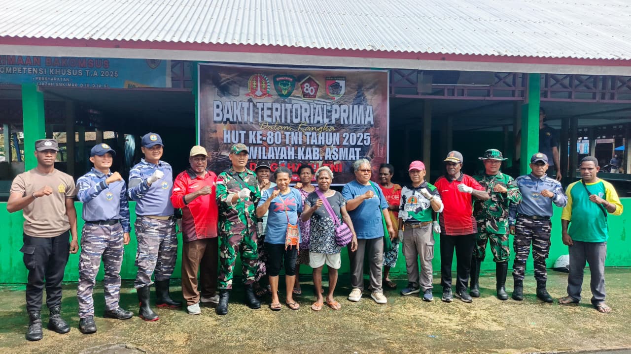 Delik Asia, (Kota Agats) | Dalam rangka menyambut HUT TNI ke-80, Pos Komando Utama Satgas Yonif 123/Rajawali bersama Koramil 1707-08/Agats melaksanakan kegiatan Bakti Teritorial Prima di Pasar Mama Muyu, Kota Agats, Rabu (17/9/2025).