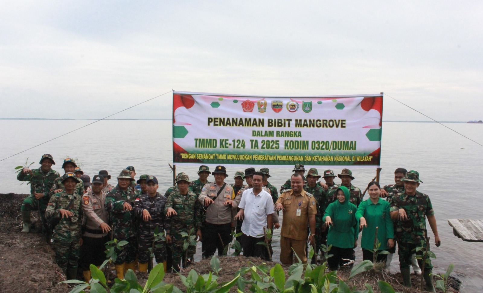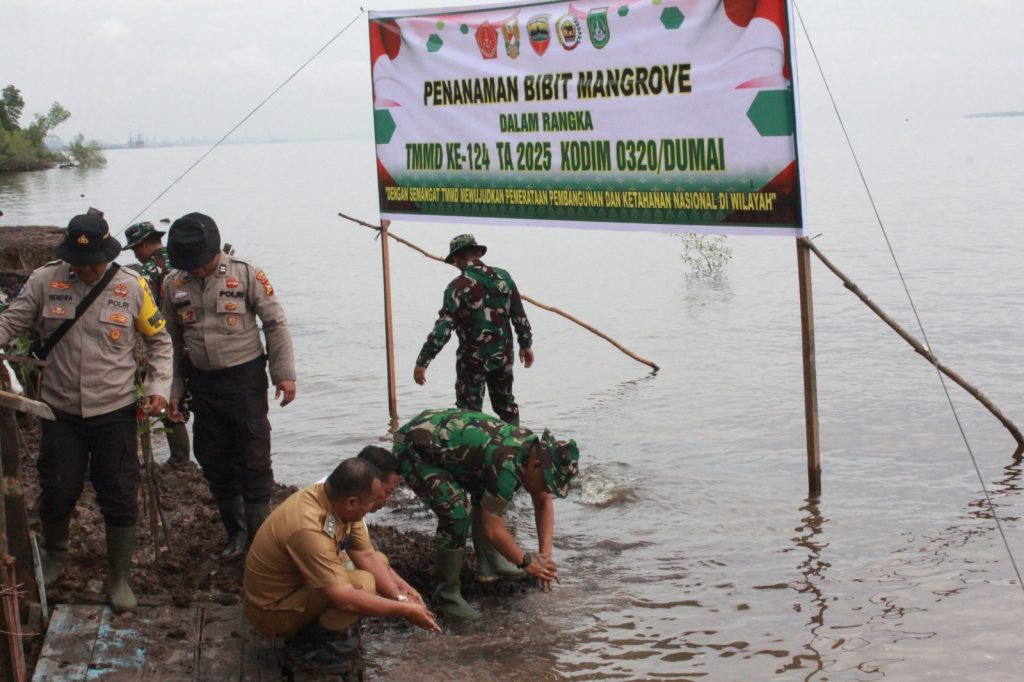 DelikAsia, (Dumai-Riau) | Semangat gotong royong dan kepedulian terhadap lingkungan terpancar jelas di Pantai Purnama, Dumai, hari ini. Ratusan bibit pohon mangrove ditanam secara serentak dalam sebuah kegiatan yang merupakan bagian dari rangkaian TNI Manunggal Membangun Desa (TMMD) ke-124 yang diselenggarakan oleh Kodim 0320/Dumai.