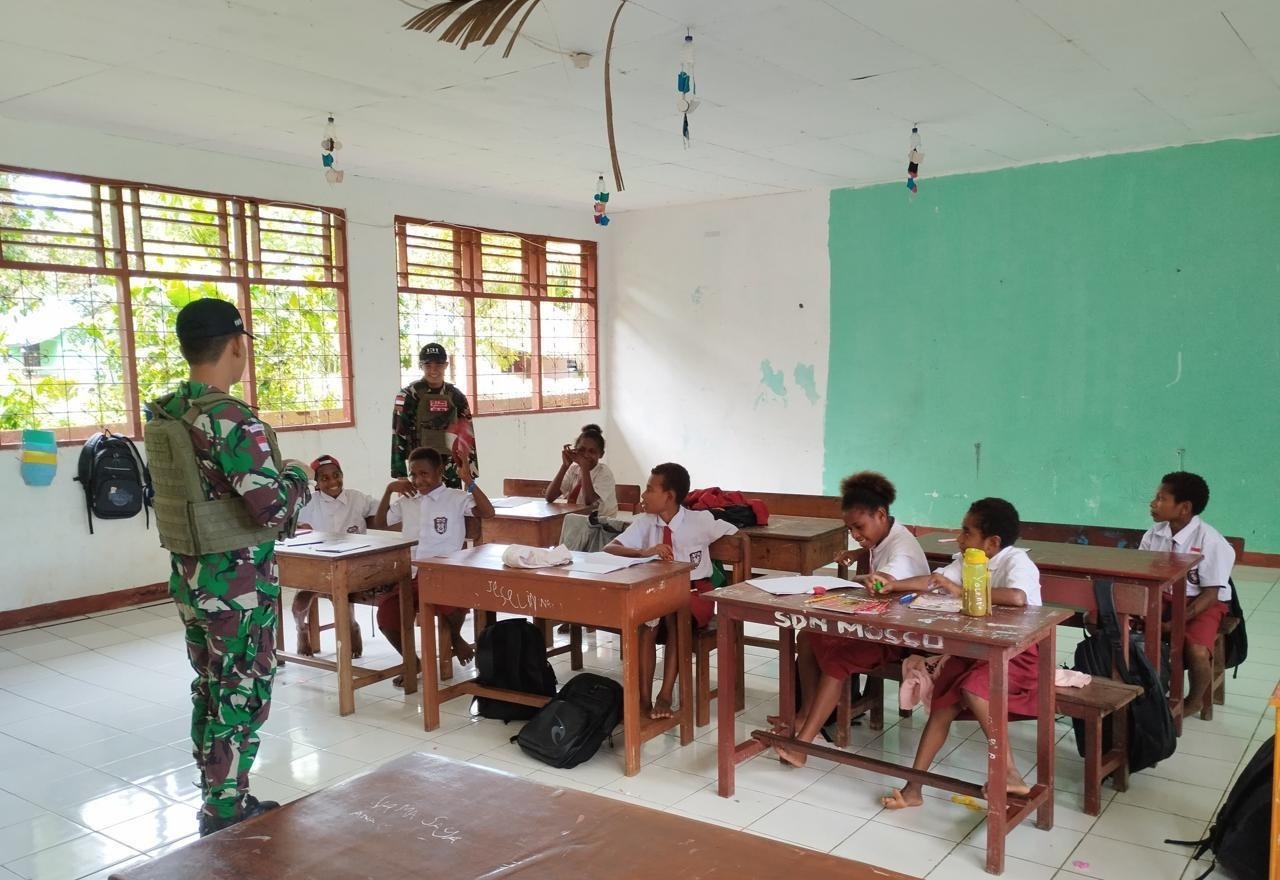 Delik Asia, (Jayapura) |  Suasana ruang kelas SD Negeri Mosso di Kampung Mosso, Kecamatan Muara Tami, Kota Jayapura, tampak berbeda pada Senin pagi, 28 Juli 2025. Seragam loreng menghiasi bangku guru. Para prajurit dari Satgas Yonif 131/Brajasakti, dipimpin Serka Fony, menggantikan sejenak peran para pendidik.