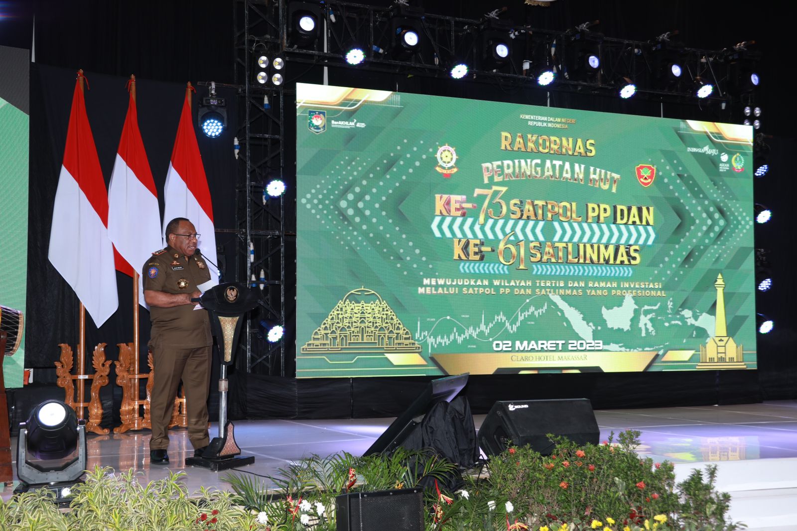 Makassar, (DelikAsia.com) | Kementerian Dalam Negeri (Kemendagri) menggelar Rapat Koordinasi Nasional (Rakornas) Peringatan Hari Ulang Tahun (HUT) ke-73 Satuan Polisi Pamong Praja (Satpol PP) dan ke-61 Satuan Perlindungan Masyarakat (Satlinmas) di Ballroom Hotel Claro, Makassar, Kamis (2/3/2023). Rakornas tersebut mengusung tema “Mewujudkan Wilayah Tertib dan Ramah Investasi melalui Satpol PP dan Satlinmas yang Profesional”.