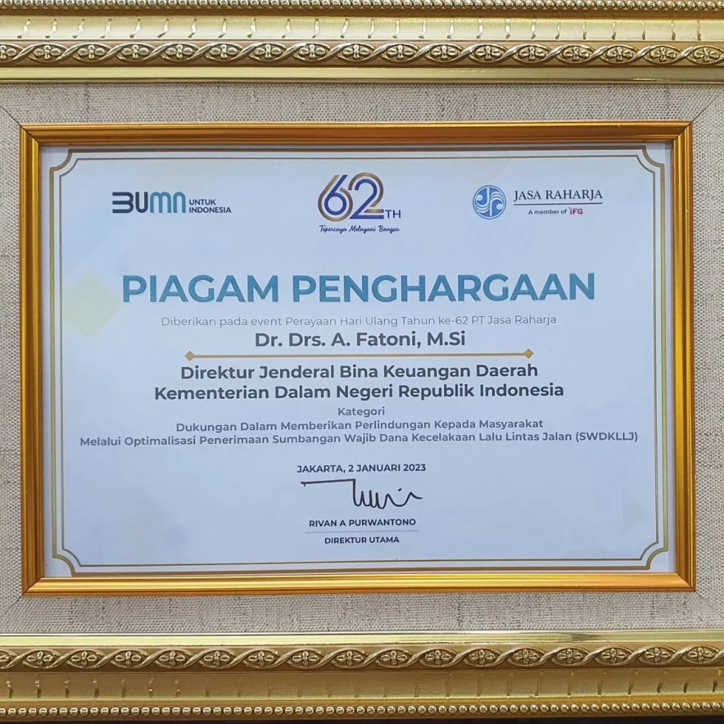 Penghargaan diberikan langsung oleh Direktur Utama (Dirut) PT Jasa Raharja Rivan Achmad Purwantono pada Hari Ulang Tahun PT Jasa Raharja ke-62, di Jakarta, Senin (2/1/2023). Dalam acara tersebut, Rivan menyampaikan bahwa penghargaan itu diberikan kepada Dirjen Bina Keuda secara pribadi dan tim atas kiprahnya dalam melakukan inovasi serta gebrakan positif. Atas dukungan dan kerja sama yang selama ini, ujar Rivan, Jasa Raharja dapat melampaui target pada tahun 2022.