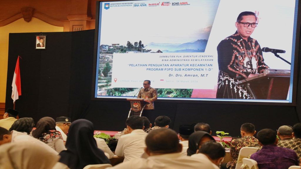 Hal tersebut disampaikan Pelaksana Harian (Plh.) Direktur Jenderal (Dirjen) Bina Adwil Amran saat membuka pelatihan aparatur camat di Hotel Lombok Raya, Senin (18/3/2024). Kegiatan ini dilaksanakan secara serentak di Provinsi Jawa Timur dan Provinsi Aceh, dengan total peserta lebih dari 954 orang yang berasal dari Kantor Kecamatan, Unit Pelaksana Teknis Dinas (UPTD) Pendidikan, dan UPTD Kesehatan.