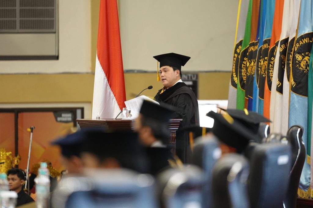untuk menari. Tidak sekadar menari, tapi beyond tarian. Tarian yang lincah, indah, dan bertenaga di dalam persaingan ekonomi global,” ujar Erick dalam orasi ilmiahnya bertajuk “Eternitas Transformasi BUMN: Strategi Terobosan untuk Kebangkitan Ekonomi Indonesia Baru” saat menerima penganugerahan Doktor Honoris Causa bidang Manajemen Strategis pada Fakultas Ekonomi dan Bisnis (FEB), Universitas Brawijaya, Malang, Jawa Timur (Jatim), Jumat (3/3/2023).