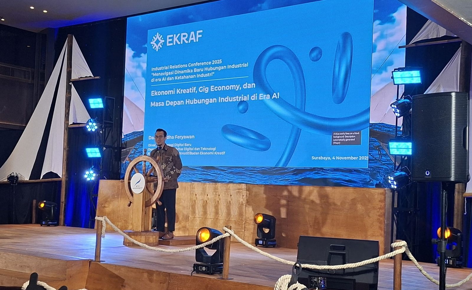 Caption: Direktur Teknologi Digital Baru Kementerian Ekraf, Dandy Yudha Feryawan, memberi sambutan pada kegiatan Industrial Relations Conference 2025 yang digelar oleh Apindo Training Center (ATC) di Hotel Platinum, Surabaya, Selasa (4/11/2025). Surabaya, (DelikAsia) | Kementerian Ekonomi Kreatif/Badan Ekonomi Kreatif (Ekraf) mendorong pemanfaatan Artificial Intelligence (AI) untuk memperkuat gig economy yang kini menjadi tulang punggung bagi lebih dari 60 persen generasi muda. Langkah ini diambil menyikapi potensi pasar AI Indonesia yang diproyeksikan melonjak dari 1,77 miliar dolar AS pada 2023 menjadi 10,89 miliar dolar pada 2030, meski tingkat adopsi dan talentanya masih rendah.