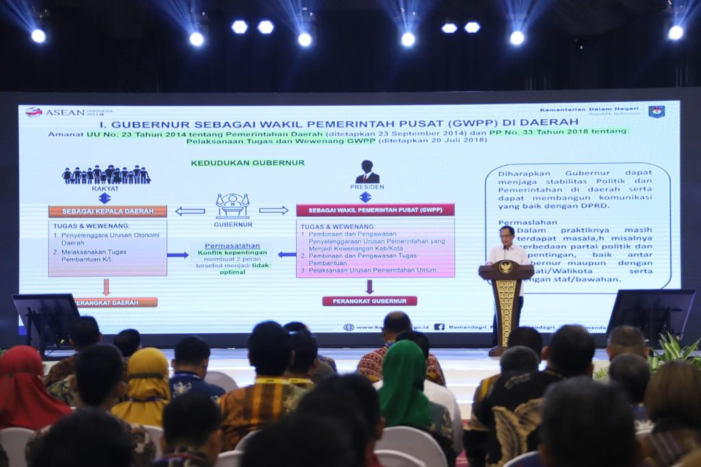 “Gubernur sebagai wakil pemerintah pusat di daerah bahkan diberikan anggaran dan instrumen hukum, instrumen kewenangan yang lainnya, ada dana dekonsentrasi, kemudian ada instrumen kewenangan-kewenangan. Bapak-Bapak dan Ibu-Ibu Gubernur bisa melakukan reviu APBD pada pemerintah kabupaten/kota. Mutasi juga harus melalui gubernur, ada approve dari gubernur. Ada banyak sekali kewenangan diberikan,” katanya,