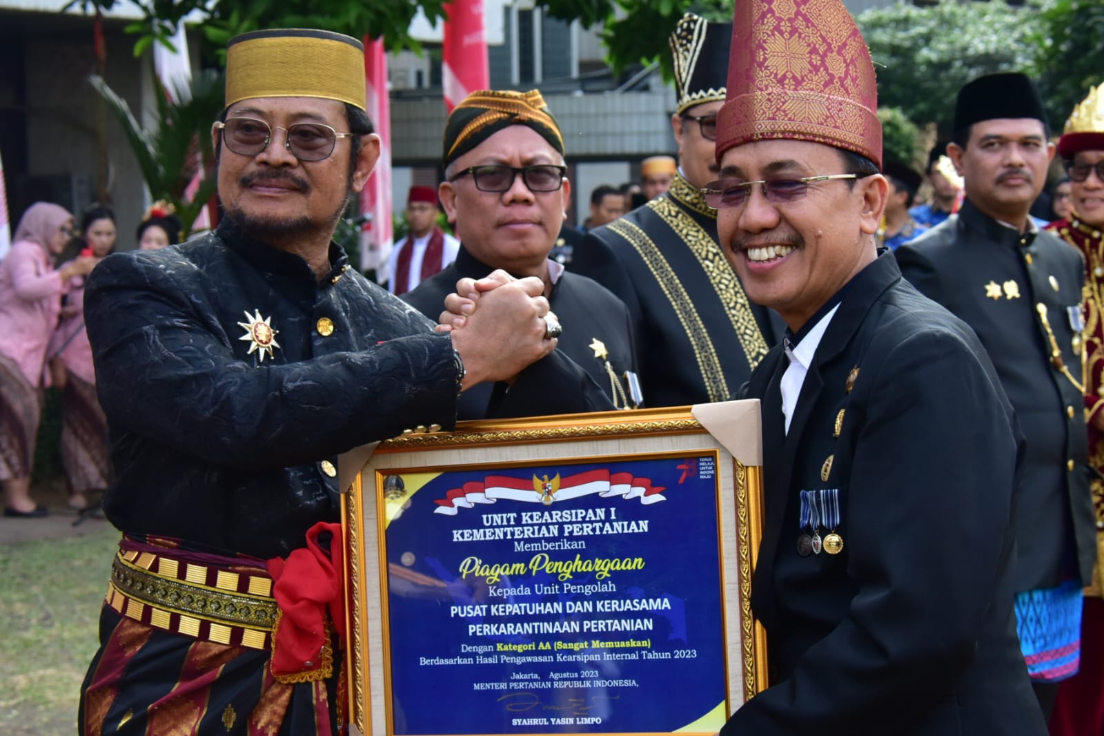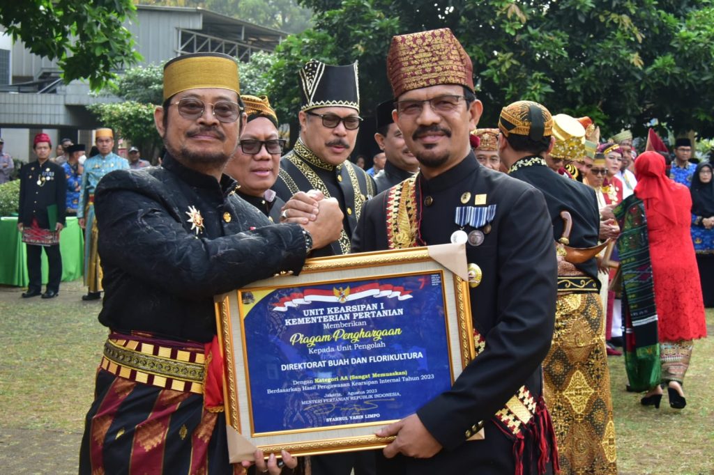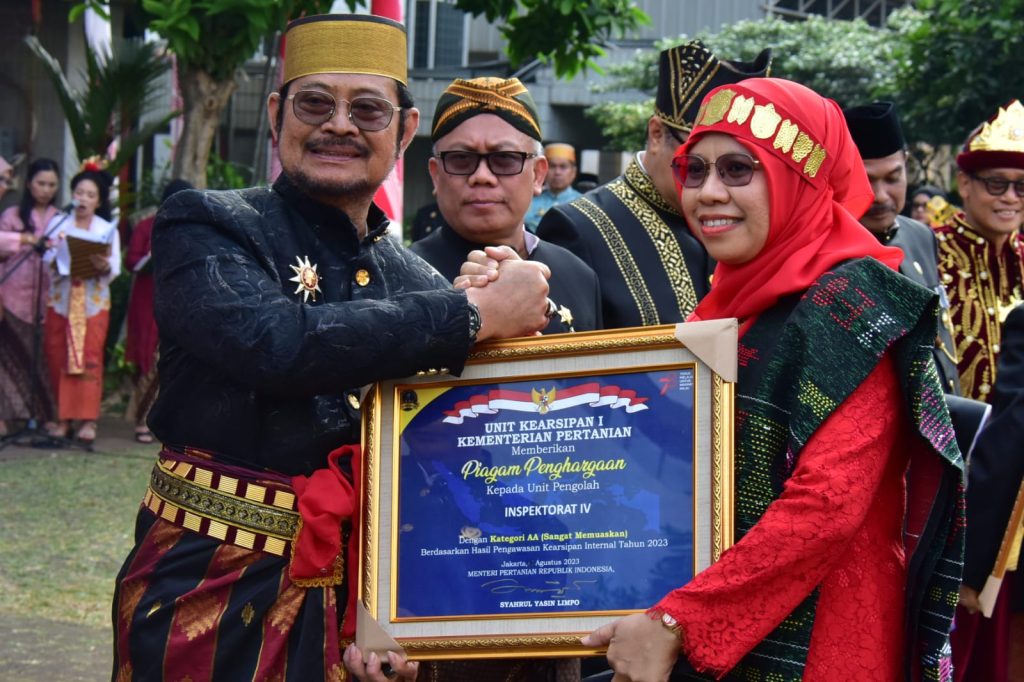 Dalam rangkaian upacara yang digelar di kantor pusat Kementan, Mentan Syahrul secara langsung memberikan penghargaan kepada empat Unit Pengolah yang mencatat pencapaian terbaik dalam pengawasan kearsipan tahun 2023 dengan predikat kategori “AA” (Sangat Memuaskan). Penghargaan ini didasarkan pada Keputusan Menteri Pertanian R.I. Nomor/482/KPTS/TU.110/M/08/2023 tentang Penetapan Hasil Pengawasan Kearsipan Internal Kementerian Pertanian Tahun 2023, terhadap 20 Unit Pengolah arsip (Eselon II Pusat) yang di audit.