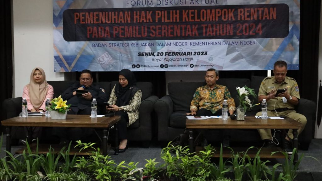 Bogor, (DelikAsia.com) | Badan Strategi Kebijakan Dalam Negeri (BSKDN) Kementerian Dalam Negeri (Kemendagri) berupaya menjaring masukan dari berbagai pakar terkait dengan pemenuhan hak pilih kelompok rentan dalam pemilihan umum (pemilu). Langkah itu dilakukan sebagai bagian dari upaya BSKDN dalam mendukung penyelenggaraan Pemilu Serentak 2024, terutama dalam meningkatkan partisipasi pemilih.