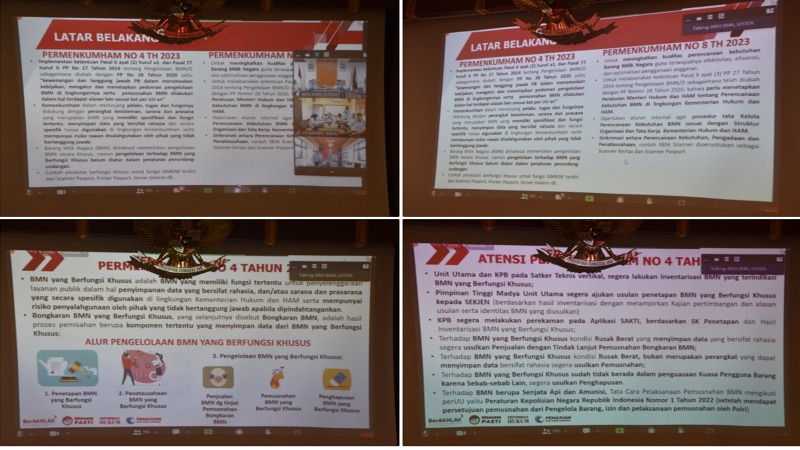 Pada kesempatan ini, Novita Ilmaris selaku Kepala Biro BMN menjelaskan bahwa hal yang melatar belakangi sosialisasi ini adalah Permenkumham No. 4 Tahun 2023 mengenai implementasi ketentuan Pasal 6 ayat (2) huruf a1 dan Pasal 77 huruf b PP No. 27 Tahun 2014 tentang Pengelolaan BMN/D sebagaimana diubah dengan PP No. 28 Tahun 2020 yaitu “Kewenangan dan tanggung jawab PB dalam merumuskan kebijakan, mengatur dan menetapkan pedoman pengelolaan BMN di lingkungannya serta pemusnahan BMN dilakukan dalam hal terdapat alas an lain sesuai ketentuan per-UU-an”.